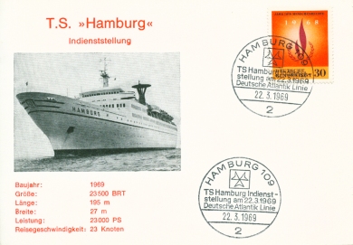 T/S HAMBURG läuft am 21. Februar bei der Deutschen Werft, Hamburg, vom Stapel und wird, nach der Probefahrt zwischen dem 12.-15. Februar, zum 20. März an die Deutsche Atlantik-Linie, Hamburg, übergeben. Am 21. Februar wird das Schiff von Marie-Luise Kiesinger, die Frau des Bundespräsidenten Kurt Georg Kiesinger getauft. Am 28. März beginnt die erste 36 tägigen Galareise von Cuxhaven nach Westafrika und Südamerika. |